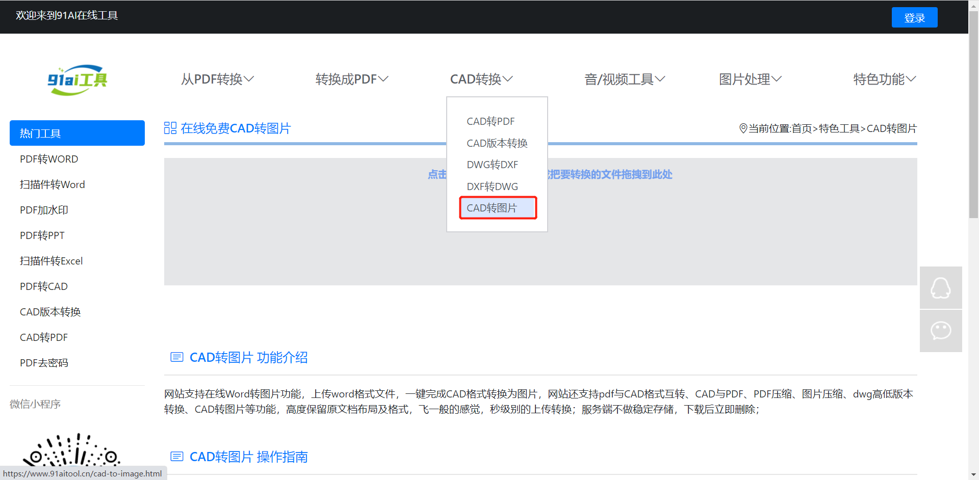 1、电脑浏览器打开网站地址:www.91aitool.cn ,在顶部导航栏“CAD转换”中选择“CAD转图片”;